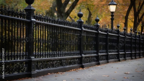 Serene park scene with intricate black iron fence, decorative balusters, street lamps, fallen leaves, and autumn trees in background.
