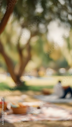 Serene picnic scene evokes casual outdoor leisure bathed in warm sunlight and gentle shadows