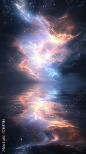 Serene reflection of galaxy on calm lake magical nightscape digital art tranquil environment aesthetic viewpoint