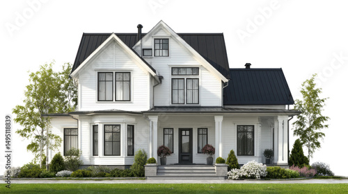 Serene Residence: A classic white two-story house, exuding timeless elegance with a black roof and lush green accents. The well-maintained landscape and inviting porch add to the curb appeal.