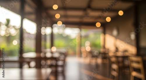 Serene Restaurant Interior Blurred Background of Wooden Tables and Warm Lighting