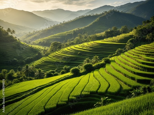 Serene Rice Terraces: Lush Green Landscape in Southeast Asia at Golden Hour - Stunning Mountain Views