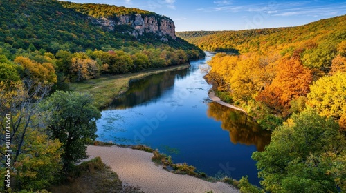 river, landscape, autumn, foliage, mountain, nature, water, tree, sky, horizon, outdoors, calmness, scenic, peaceful, view, bright, colourful, flora, environment, wilderness, warm, scenic beauty, shore, sunlight, leisure, tour tourism, adventure, seasonal, forest, vale, exploration, beauty, natural, vibrant, blue, cliff, relaxation, serene, weekend, escape, remote, travel, colours