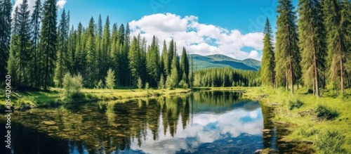 river, forest, green, tree, water, sky, cloud, nature, landscape, tranquil, serene, lush, peaceful, summer, blue, white, calm, pine, coniferous, wood, mountain, mountain, hill, grass, field, meadow, vegetation, foliage, sun, sunshine, day, bright, horizon, scenery, natural