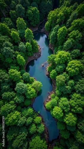 Serene river winding through lush rainforest vibrant greens creating a wild natural scene