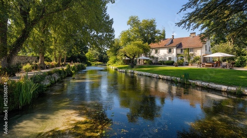 river, house, estate, water, tree, green, grass, countryside, french, home, building, landscape, nature, scenic, summer, sunny, day, calm, peaceful, tranquil, serene, idylli, picturesque, beautiful, elegant, luxury, property, garden, path, canal, stream, bank, shore, vegetation, outdoors, rural, area, view, scenery