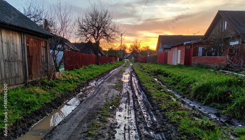 path, sunset, sky, cloud, countryside, road, mud, nature, rustic, village, evening, landscape, plant, grass, tree, puddle, reflections, tranquil, dirt, trail, residential, habitat, outdoors, scenery, rural, farm, quiet, weather, natural, warm, colourful, horizon, light, spring, peaceful, solitude, environment, atmospheric, backyard, setting, travel, journey, exploration, adventure, dirt road, home