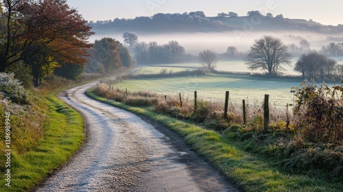 road, mist, morning, rural, countryside, landscape, nature, greenery, tree, fog, tranquil, serene, environment, travel, scenery, path, sunlight, autumn, peaceful, hill, field, agriculture, winding, natural, way, sky, meadow, horizon, blue, ground, scene, foggy, view, wanderlust