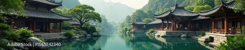 Serene scene at a Far Eastern temple, featuring intricate architecture, calming water features, and lush gardens, embodying peace and spirituality , trees, sky, rocks