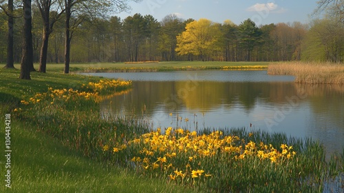 duck pond, water, yellow flower, spring, nature, landscape, tree, greengrass, sunny, calm, peaceful, scenic, daytime, park, river, plant, vegetation, countryside, environment, wildlife, flora, scenic view, natural beauty, tranquil, serene, meadow, field, sunshine, bright, summer, fresh, vibrant, colourful, yellow, green, blue, sky, cloud, horizon, background, foreground, still, aquatic plant, reed