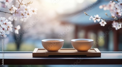 tea, cup, spring, cherry, blossom, flower, window, view, zen, calm, peaceful, tranquil, serene, quiet, still, gentle, soft, sunlight, sun, warm, light, bright, morning, day, beautiful, aesthetic, elegant, refined, simple, minimalist, natural, organic, wooden, bamboo, tray, table, background, blurred, outdoors, garden, house, temple, asia, culture, tradition, ceremony, ritual, relaxation, meditation