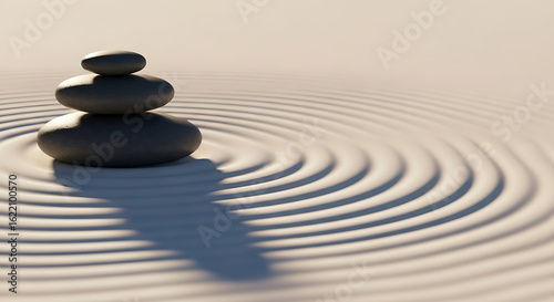 Serene stacked stones on rippled sand evoke tranquility and mindful balance for wellness and spa concepts.