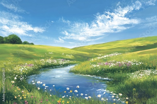 landscape, nature, summer, meadow, field, stream, river, flower, wildflower, grass, green, blue, sky, cloud, sun, day, hill, rolling, scenic, beautiful, idylli, peaceful, tranquil, serene, calm, relaxing, vibrant, colourful, bright, light, countryside, rural, environment, ecology, botany, flora, vegetation, springtime, pasture, farmland, water, plant, blossom