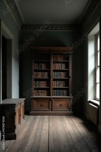Serene Study Antique Wooden Bookcase Filled with Leather-Bound Volumes, Natural Light Streaming Through Tall Window, Dark Walls, Hardwood Floor