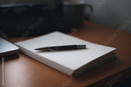 serene, study, desk, single, notebook, pen, personal, workspace, minimalistic, capture, balanced, composition, soft, lighting, highlighting, sense, solitude, contemplation, include, ample, clean, image, area, around, additional, element, copy space, text, unique, minimal, visual, high-quality, background, creative, scene