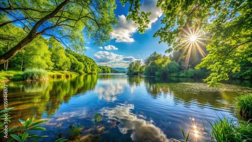Serene Summer Landscape with Lush Greenery and Sunlight Reflections on Water, Capturing Nature's Beauty in a Tranquil Setting