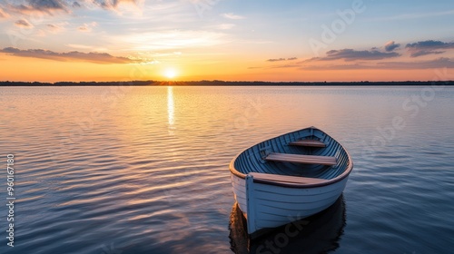 Serene Summer Sunset, tranquil lake reflecting warm hues, small boat gently docked, inviting atmosphere for personal messages, peaceful escape into nature's beauty.