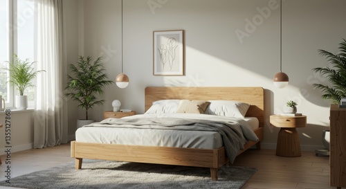 Serene Sunlight Bedroom Sanctuary - Calm, minimalist bedroom design. Sunlight streams in, highlighting soft linens, a wooden bed, and simple bedside tables. Peace, tranquility, relaxation, comfort