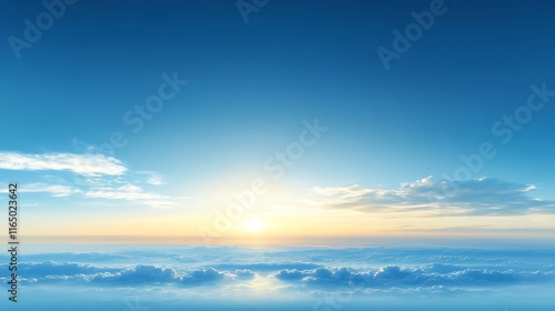 sky, cloud, sunrise, sun, blue, peaceful, calm, serene, tranquil, aethereal, heavenly, majestic, huge, expansive, horizon, dawn, daybreak, light, gold, orange, yellow, white, fluffy, cotton, soft, gentle, atmosphere, air, height, altitude, view, perspective, beauty, nature, scene, landscape, wonder, awe, inspirational, dreamscape, celestial, up high, beneath