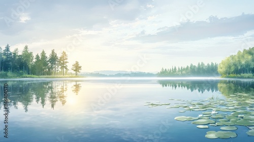 lake, sunrise, calm, water, mist, morning, serene, peaceful, tranquil, nature, landscape, scenery, tree, sky, cloud, sun, light, summer, dawn, quiet, stillness, beauty, idylli, serenity, pristine, untouched, wilderness, environment, ecology, ecosystem, flora, fauna, aquatic, plant, water lily, green, blue, horizon, scenic, view, panorama, picturesque