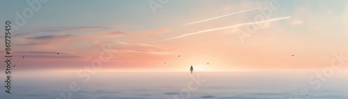 Serene sunrise over calm sea with soft pastel sky, lone silhouette in distance, creating a peaceful and tranquil scene.
