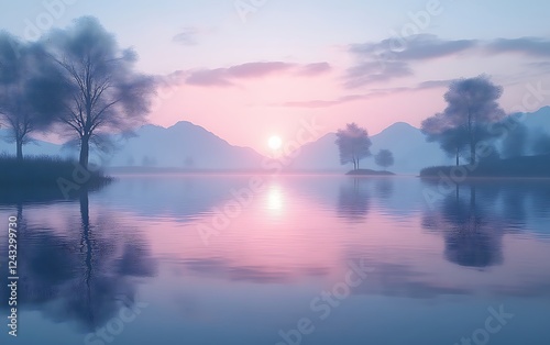 sunrise, sunset, lake, water, tree, mist, fog, mountain, sky, cloud, peaceful, calm, serene, tranquil, quiet, nature, landscape, scenery, beauty, idylli, dreamy, magical, aethereal, pastel, pink, purple, blue, soft, light, dawn, dusk, horizon, still, environment, wilderness, view, scene, image, photo