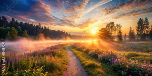 Serene Sunrise Path Through Misty Meadow with Wildflowers