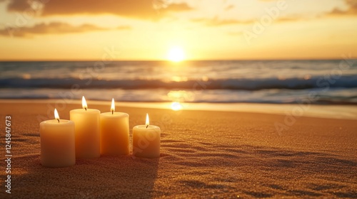 Serene Sunset Beach Scene with Lit Candles in Sand Peaceful Ocean View