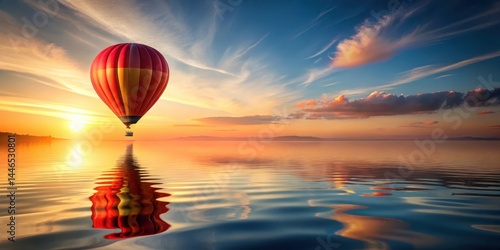 Serene Sunset Flight Over Calm Water A Hot Air Balloon's Gentle Ascent at Dawn Reflecting on a Tranquil Lake