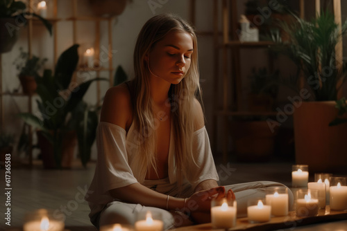 Serene Sunset Meditation. Woman meditating on a serene beach at sunset, surrounded by soft beige towels and calming scented candles. Copy space. Mindfulness concept. AI GENERATIVE