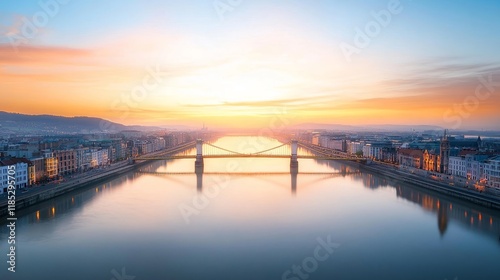 Serene Sunset Over a Majestic Bridge with Reflections on a Calm River, Highlighting the Beauty of Urban Architecture and Nature in Perfect Harmony