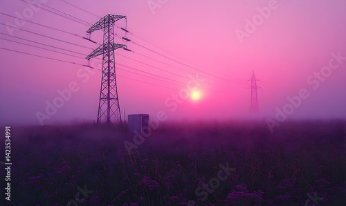 sunset, power, line, mist, field, silhouette, colourful, sky, nature, serene, landscape, electricity, dawn, twilight, horizon, beauty, tranquil, environment, scenic, fog, purple, evening, summer, skyward, rural, peaceful, dusk, plant, flower, atmospheric, gradient, light, photo, natural, view, scenery, energy, transmission, pole, soft, hue, calm, visual, depth