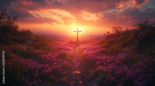 Serene sunset over a path lined with vibrant flowers leading to a cross on a hilltop