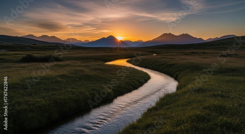 sunset, river, stream, water, flow, meadow, grass, field, nature, landscape, scenic, view, mountain, hill, sky, cloud, orange, yellow, pink, blue, light, sun, horizon, evening, dusk, twilight, peaceful, calm, tranquil, serene