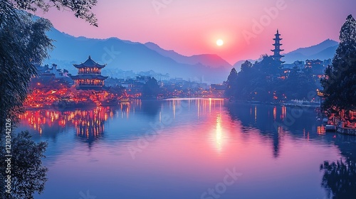 sunset, sunrise, china, village, river, water, mountain, peaceful, serene, calm, tranquil, twilight, evening, morning, landscape, scenery, travel, asia, chinese, architecture, pagoda, temple, building, light, illuminated, colourful, vibrant, pink, purple, blue, sky, cloud, nature, picturesque, beautiful, idylli, stunning, magical, dreamy, fantasy, artistic, illustration, painting, digital artwork, artwork, graphic, design, background