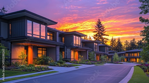 sunset, housing, architecture, beauty, skyline, modern, tree, landscape, tranquil, road, nature, evening, cloud, neighbourhood, light, residential, peaceful, design, vibrant, scenery, property, environment, colourful, sky, dusk, luxury, home, warmth, suburb, green, garden, seasonal, view, urban, setting, warm, relaxation, sunlight, scenic, calmness