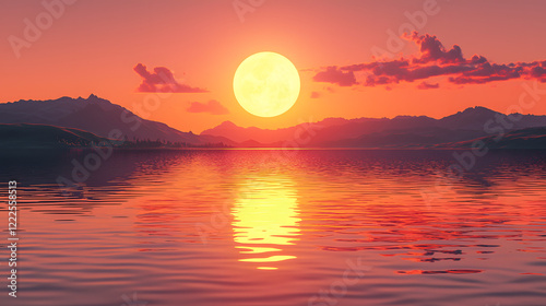 Serene Sunset over Mountain Lake: A breathtaking sunset paints the sky in vibrant hues of pink and orange, casting a golden glow on a tranquil mountain lake. The sun, partially obscured by a cloud.