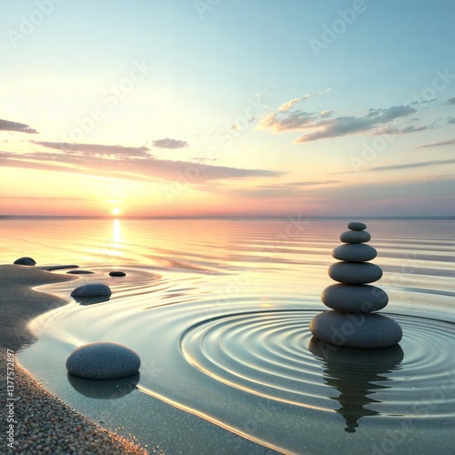 Serene sunset peace: a balanced stone cairn reflecting tranquility on calm water at golden hour