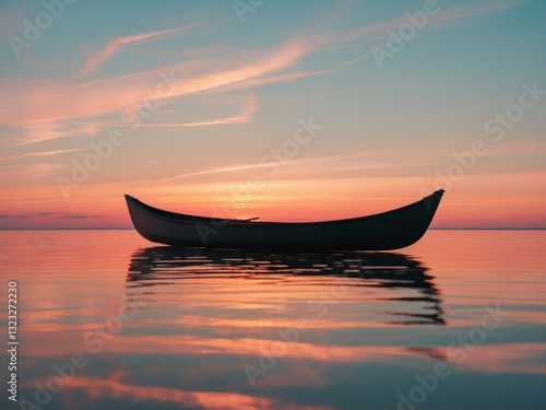 Serene Sunset Reflections Over Calm Water with a Canoe Silhouetted in the Foreground.