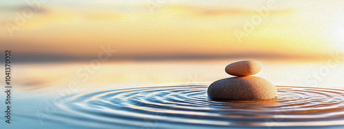Serene Sunset Stillness: Two smooth stones rest delicately balanced on calm water, creating concentric ripples at sunset. A picture of tranquility and inner peace.