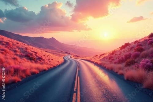 Serene Sunset Vista A Winding Asphalt Road Through Pink-Hued Hills, Bathed in the Golden Light of the Evening Sun