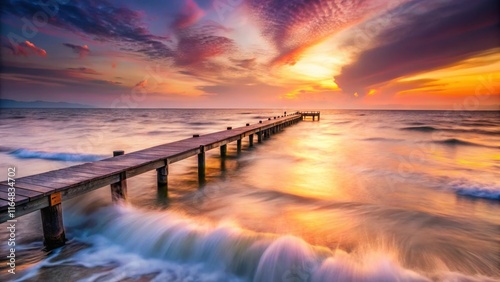 ocean, sunset, pier, wave, water, beach, sky, horizon, dusk, calm, tranquil, peaceful, serene, golden hour, picturesque, coastal, seascape, landscape, nature, twilight, vibrant