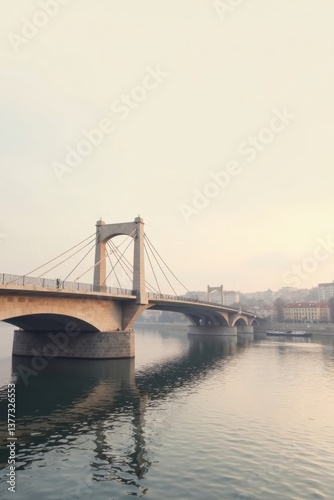 Serene Suspension Bridge Spanning Calm River Waters at Dawn