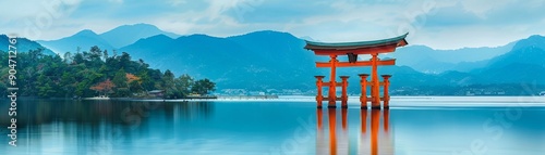 Serene Torii Gate Overlooking Calm Water Surrounded by Majestic Mountains at Dusk