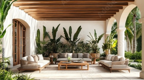 patio, furniture, tropical, luxury, relaxation, serenity, design, modern, elegant, comfort, sofa, couch, plant, garden, teak, rattan, beige, brown, wood, sun, daylight, summer, warm, calm, peaceful, tranquil, paradise, resort, home, decor, style, architecture, interior, exterior, landscaping, aesthetic, living, space, ambience, oasis