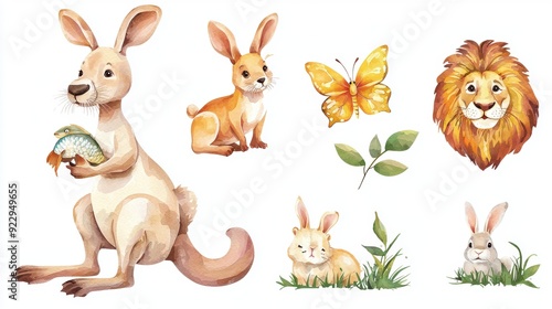 Serene Watercolor Menagerie - Kangaroo, Otter, Lion, Butterfly, Bunny on White Background