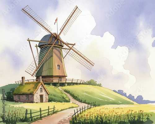 windmill, watercolor, countryside, landscape, rural, visual, serene, painting, element, detail, living, motivational, vista, picture, peaceful, technique, artistic, joyful, gentle, image, quiet, colours, graphic, inspiring, artwork, shade, power, perspective, positive, life, aesthetic, path, soft, tranquil, field, elegant, happy, grassy, vibrant, refined, watercolor, wind, mill, home, light, idylli, farmhouse, hill, classic