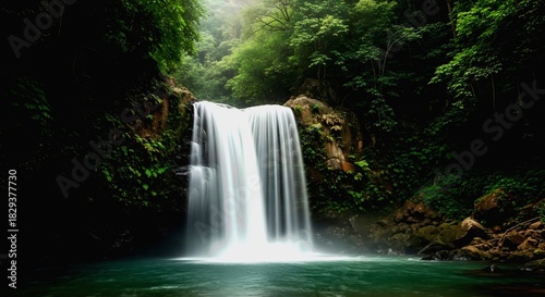 Serene Waterfall Cascading into Emerald Pool Surrounded by Lush