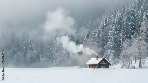 winter, cabin, snow, landscape, calmness, nature, forest, mist, cosy, seasonal, background, wooden, smoke, chimney, cold, rural, scenery, serene, outdoors, solitude, frost, countryside, shelter, holiday, peaceful, white, foggy, tree, environment, secluded, quiet, idylli, travel, vacation, escape, remote, comfort, winterly, glacé, snowfall, ai
