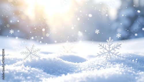 Serene winter landscape with falling snowflakes over a pristine white snow-covered ground at sunrise